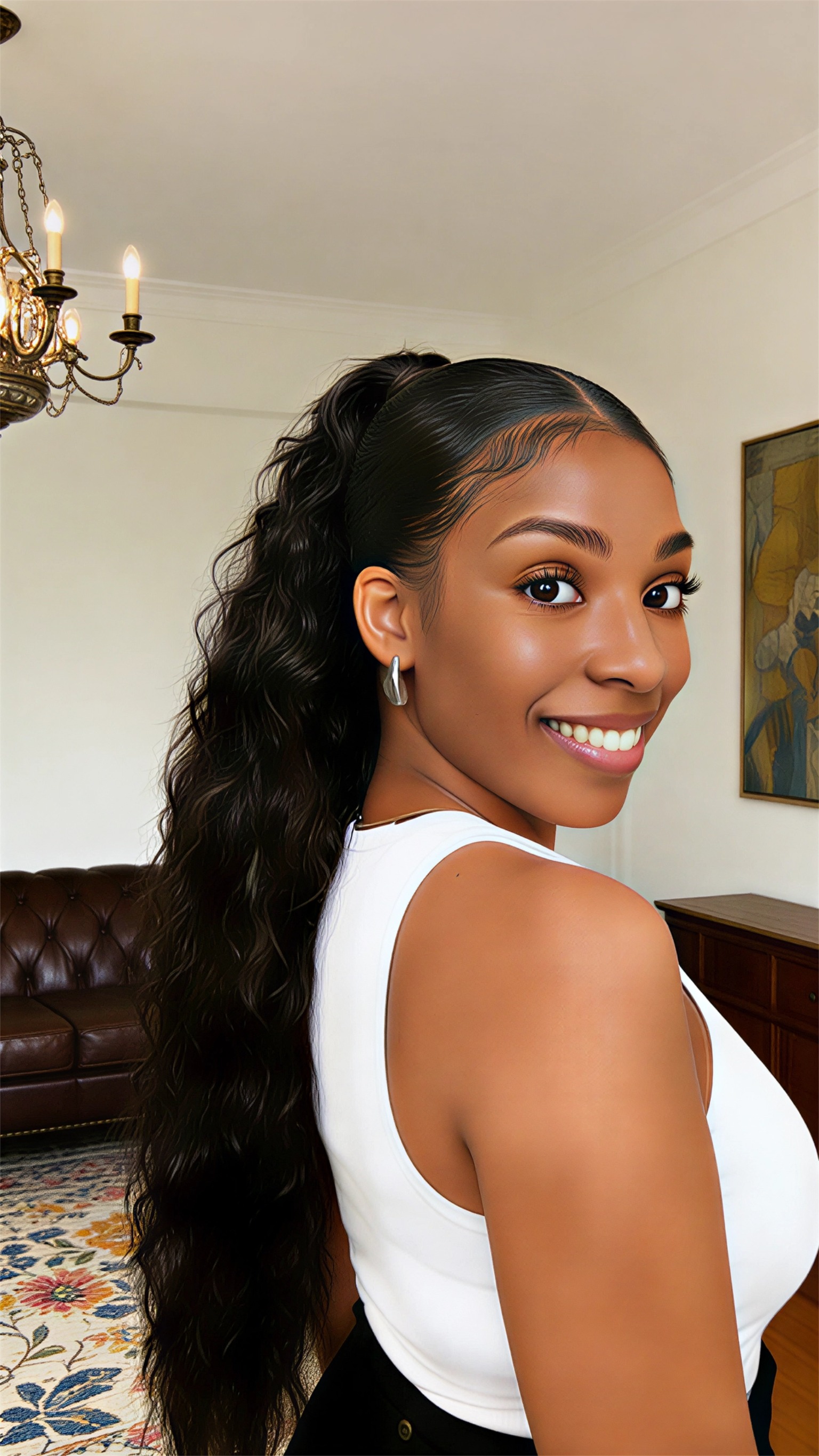 Instantly transforms into a voluminous wavy ponytail. The look becomes fuller, more elegant, and photo-ready — perfect for dates, parties, and everyday glam.