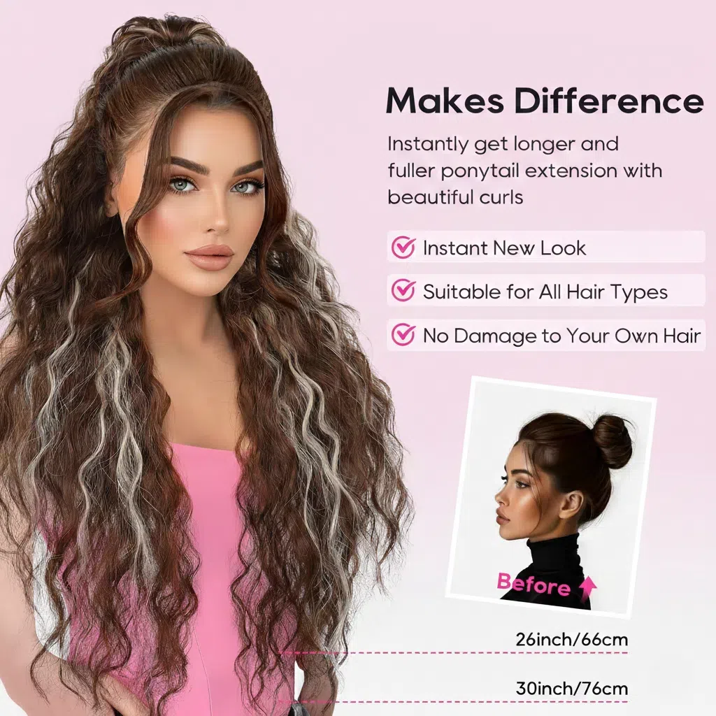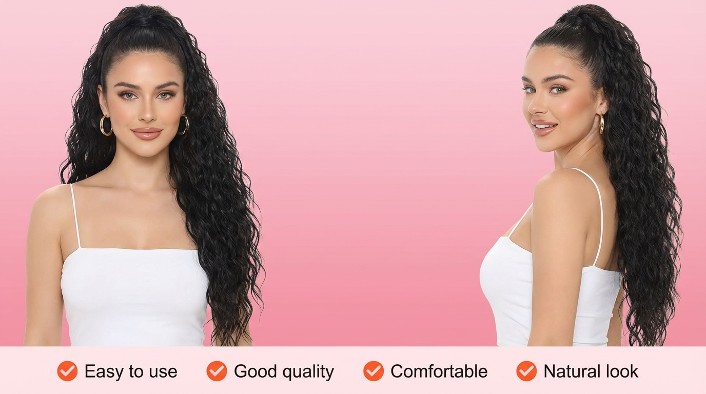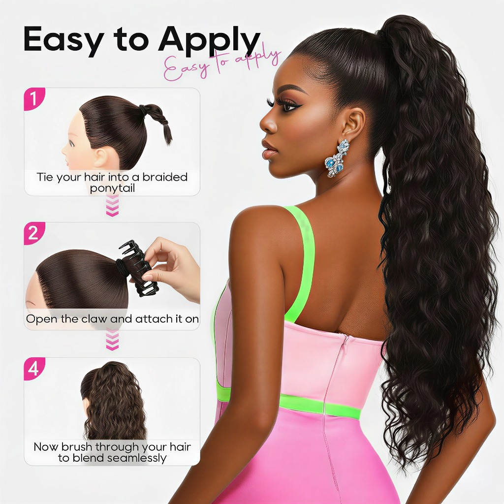 Instantly transforms into a voluminous wavy ponytail. The look becomes fuller, more elegant, and photo-ready — perfect for dates, parties, and everyday glam.